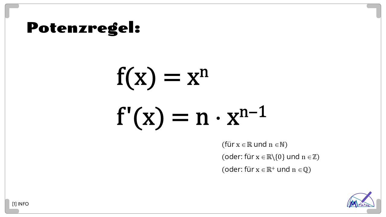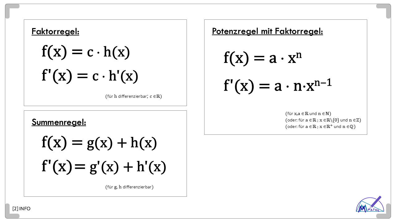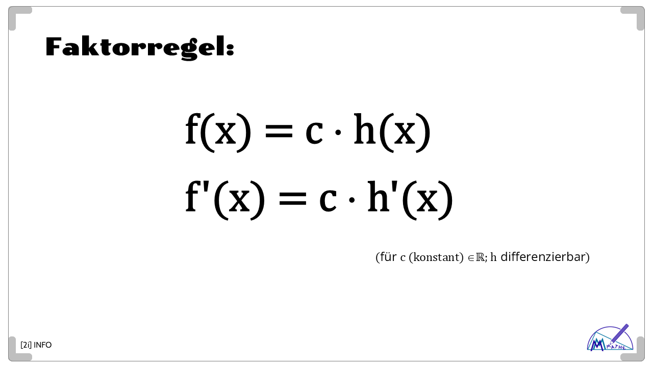 Die einfache Faktorregel gilt für jede differenzierbare Funktion (siehe oben: INFO[2]). Also auch für jede Potenzfunktion, die mit einer konstanten Zahl (die nichts mit der Variablen x zu tun hat) multipliziert wird.
