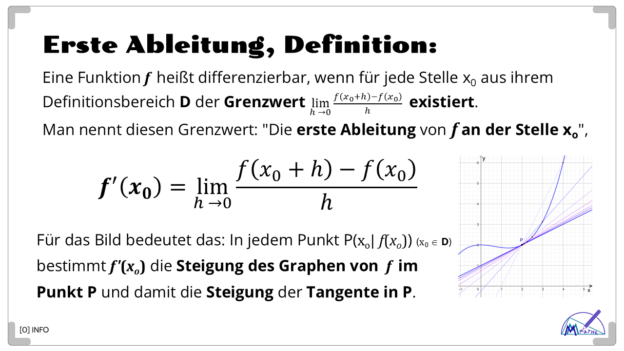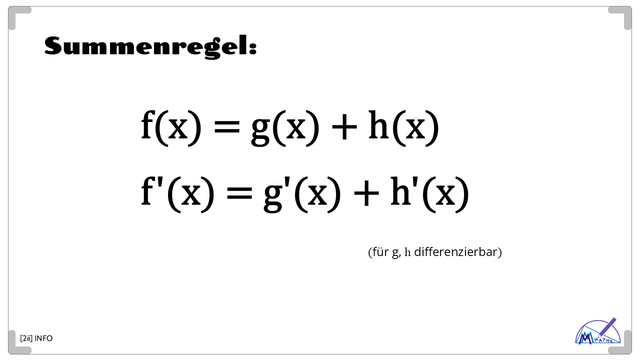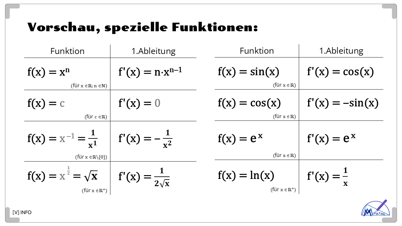 f'(x) = ?f'(x) = 10x4 f'(x) = 400x3 f'(x) = 8x f'(x) = 0 +) f'(x) = 6 +) +) siehe Sonderfälle |