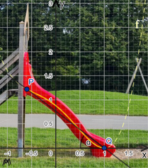 (c) Vorschau: Auch dann, wenn man in jedem Punkt der Kurve deren Steigung bestimmt kann, wird noch die Frage bleiben: Wie findet man den Punkt, in dem die Rutsche am steilsten ist? Um dann letztendlich zu klären, ob auch der steilste Winkel unter 60° liegt und damit Bedingung (2) erfüllt wäre. (Näheres dazu siehe Analysis / Kurvendiskussion.)