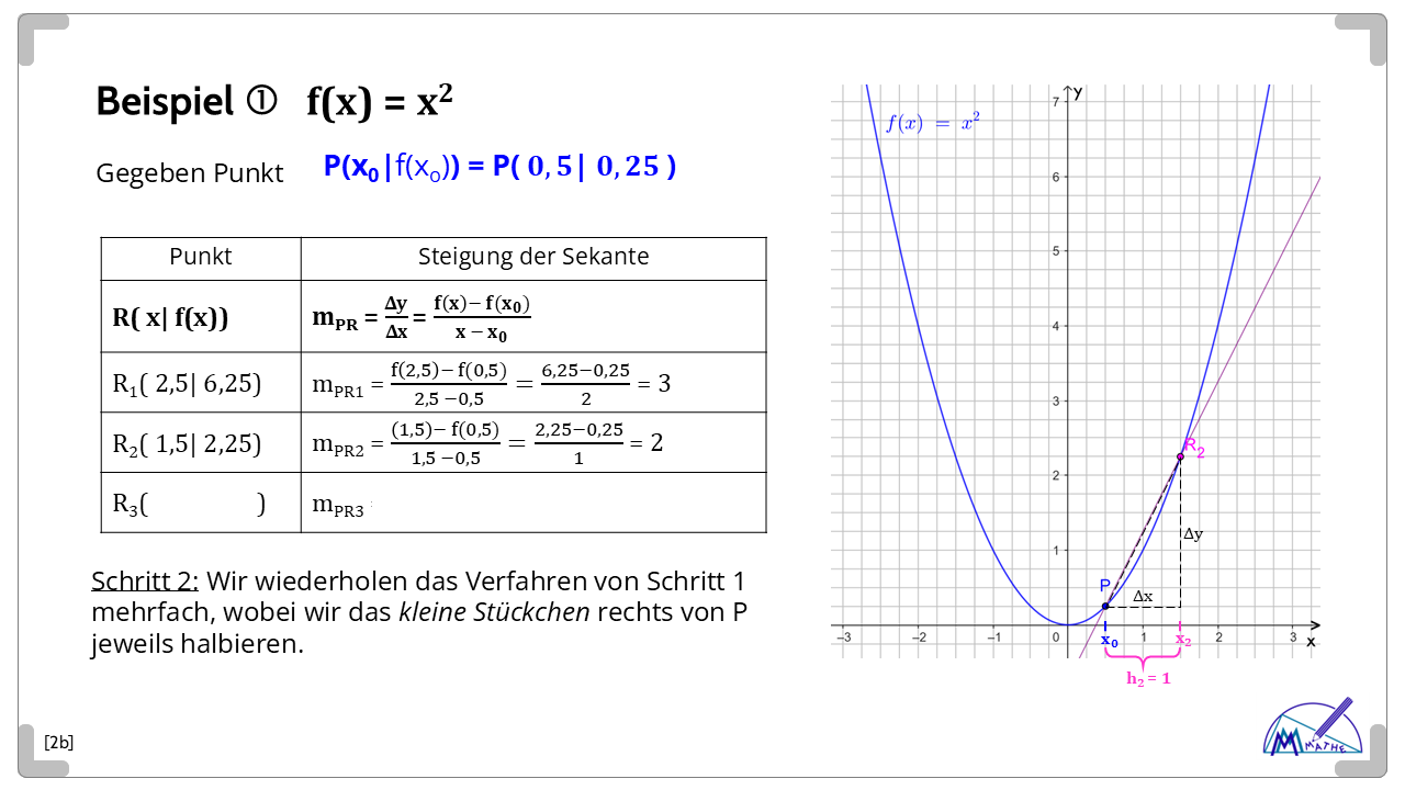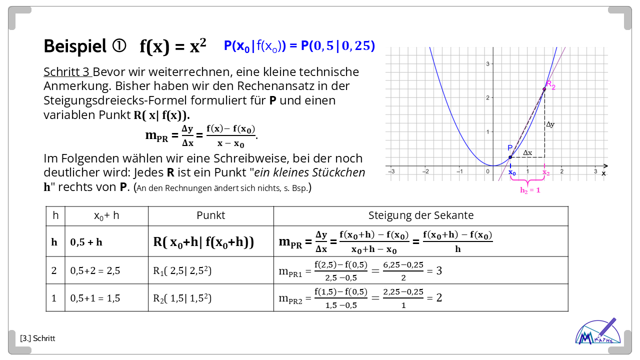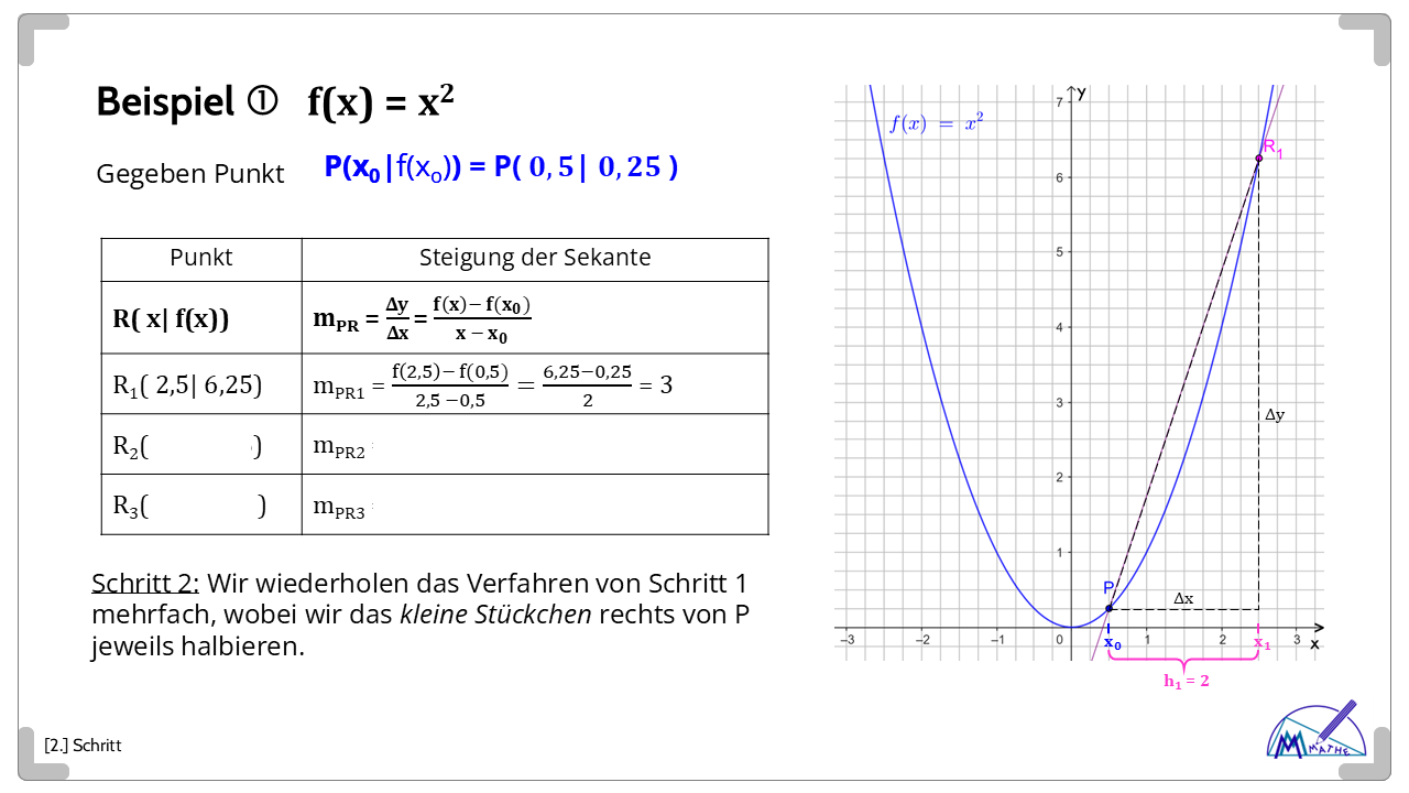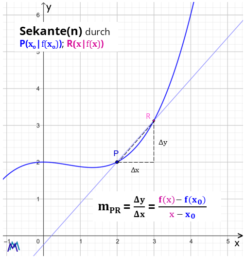 Hier bedeutet das: Es ist bekannt, wie man zu einer gegebenen Funktion f die Steigung einer Sekanten durch zwei Punkte P und R ihres Graphen mit Hilfe des Differenzenquotienten berechnet.