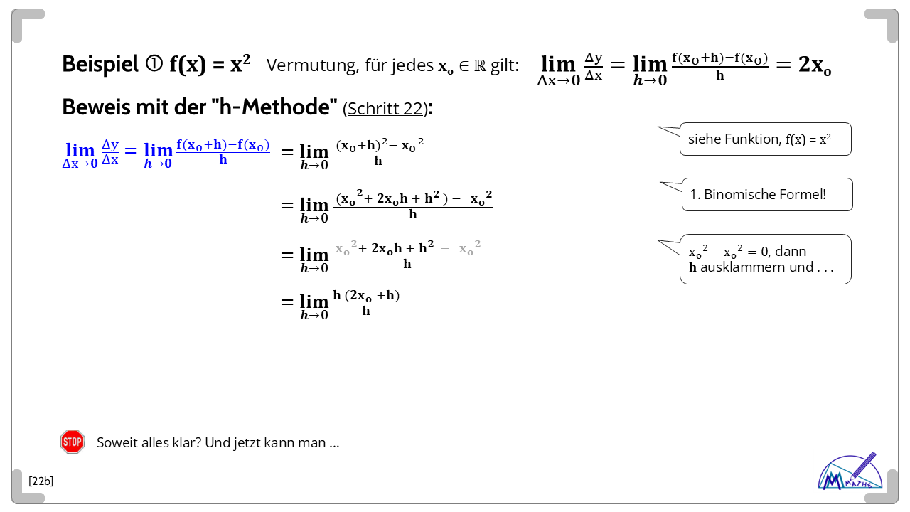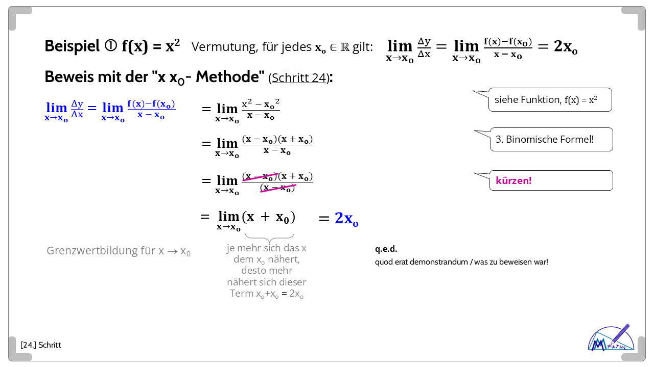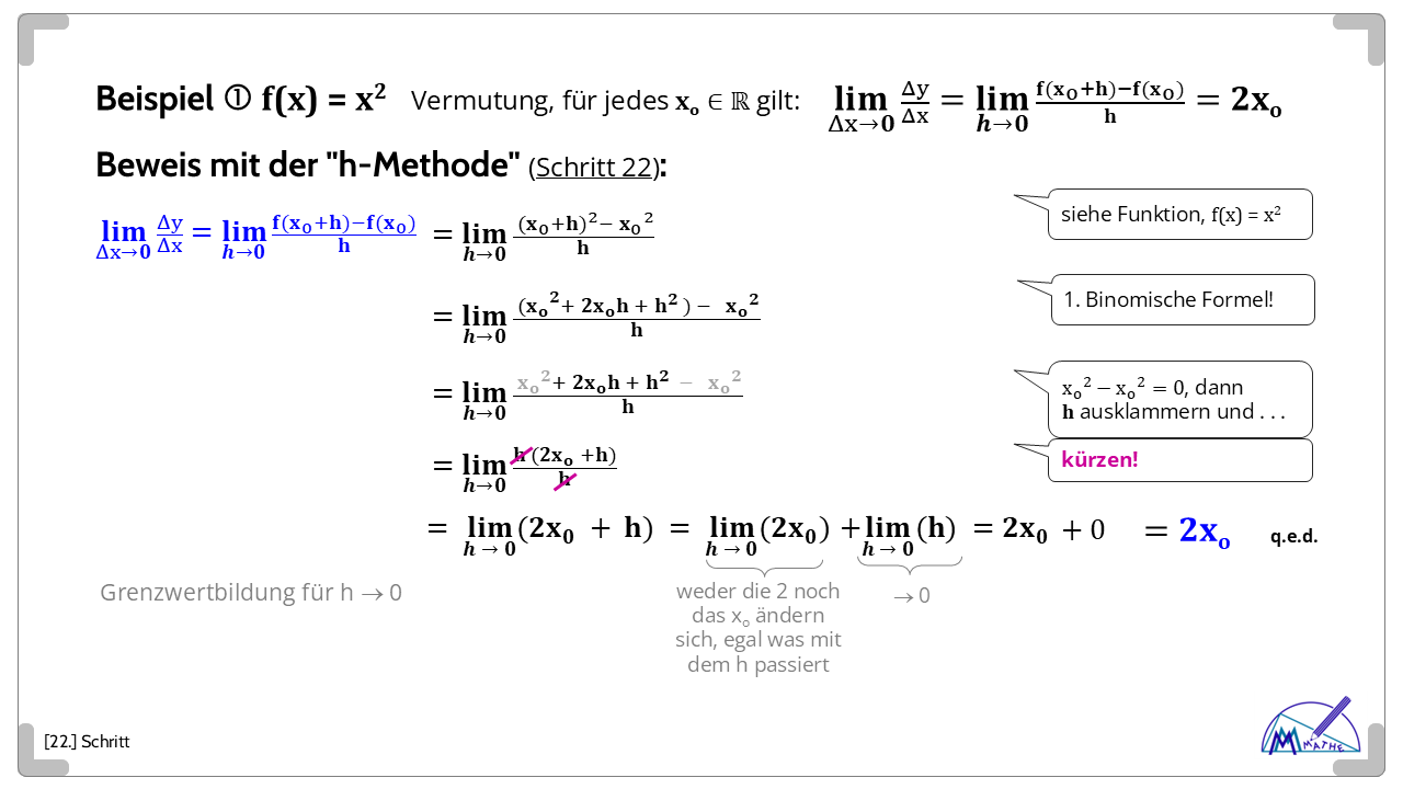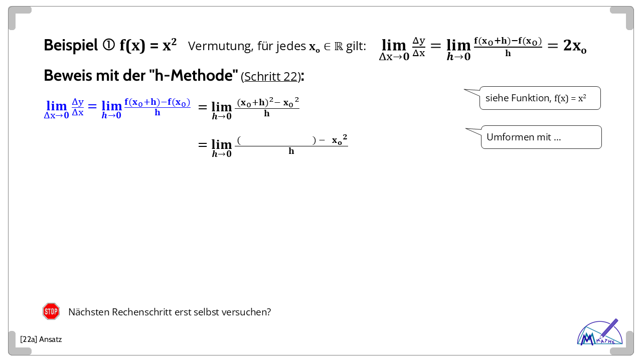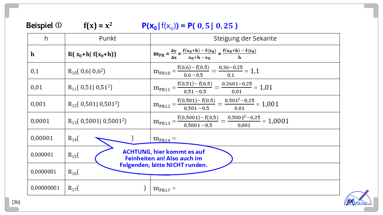 Die Herleitung der Ableitungsformel ist ein umfangreiches Kapitel. Im Schulunterricht werden Sie sich vermutlich etliche Stunden damit beschäftigen. Hier kann dieser Prozess nicht ersetzt, aber zum Nachdenken über einzelne Teilaspekte angeregt werden.