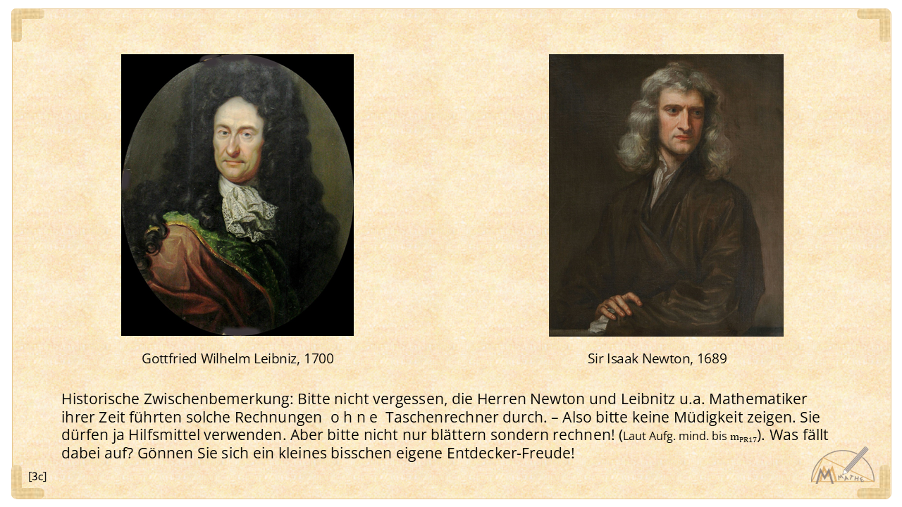 "Brauchen wir das in der Arbeit???" stellen Sie jetzt vielleicht die typische SchülerInnen-Frage. Meine Antwort: Die meisten Details vermutlich nicht! (Wie Sie vielleicht auch schon gesehen haben, hier auf der Seite wird es kein "Kompakt-Training" geben, keine Rechenschritte, die Sie unbedingt "einpauken" sollten.) Das bedeutet jetzt aber nicht, dass Sie sich zurücklehnen und gar nichts machen sollen. Versuchen Sie bei der Einführung eines so komplexen Themas, möglichst viele der Grundgedanken wenigstens im Ansatz zu erfassen (ohne gleich Angst zu bekommen, dass mathematische Erfindungen, für die die Menschheit Jahrhunderte brauchte(!), von Ihnen in der nächsten Arbeit erwartet werden). Wenn Ihnen dabei gelingt, den gedanklichen "Roten Faden" zu erkennen, dann wird Ihnen im Folgenden insgesamt vieles leichter fallen. Sowohl im Mathematik-Unterricht als auch bei eventuellen Verständnisfragen in der nächsten Arbeit.